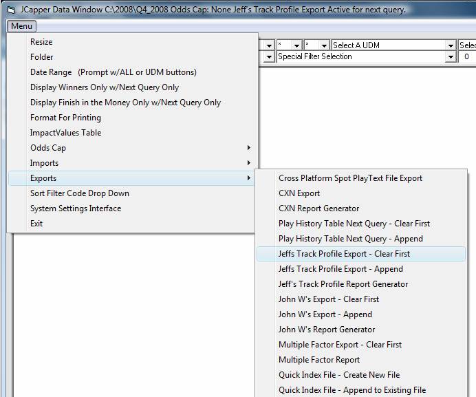 The screenshot below shows the Data Window MENU items for JCapper2008 (as of Jan 2009.) The user has already selected Jeff’s Track Profile – Clear First. Look at the title bar running across the top of the Data Window. When an export has been activated you will see text describing the type of Export that you are about to run. The Export at this point is activated. From here, to run the Export, simply click the ALL button and open a PlayList File. The Data Window will run the export while it runs your query. Once the query has finished and you see results displayed in the Data Window’s textbox your Export is complete. Export data will be sitting in the export table.