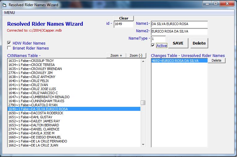 The Resolved Rider Names Wizard is a wizard style interface to the CXNNames table inside of the c:\2004\JCapper.mdb file.